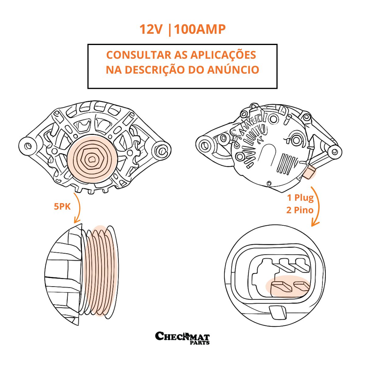 Especificação: 12VOLTS | 100AMP | Polia Estriada | Plug 2 pinos