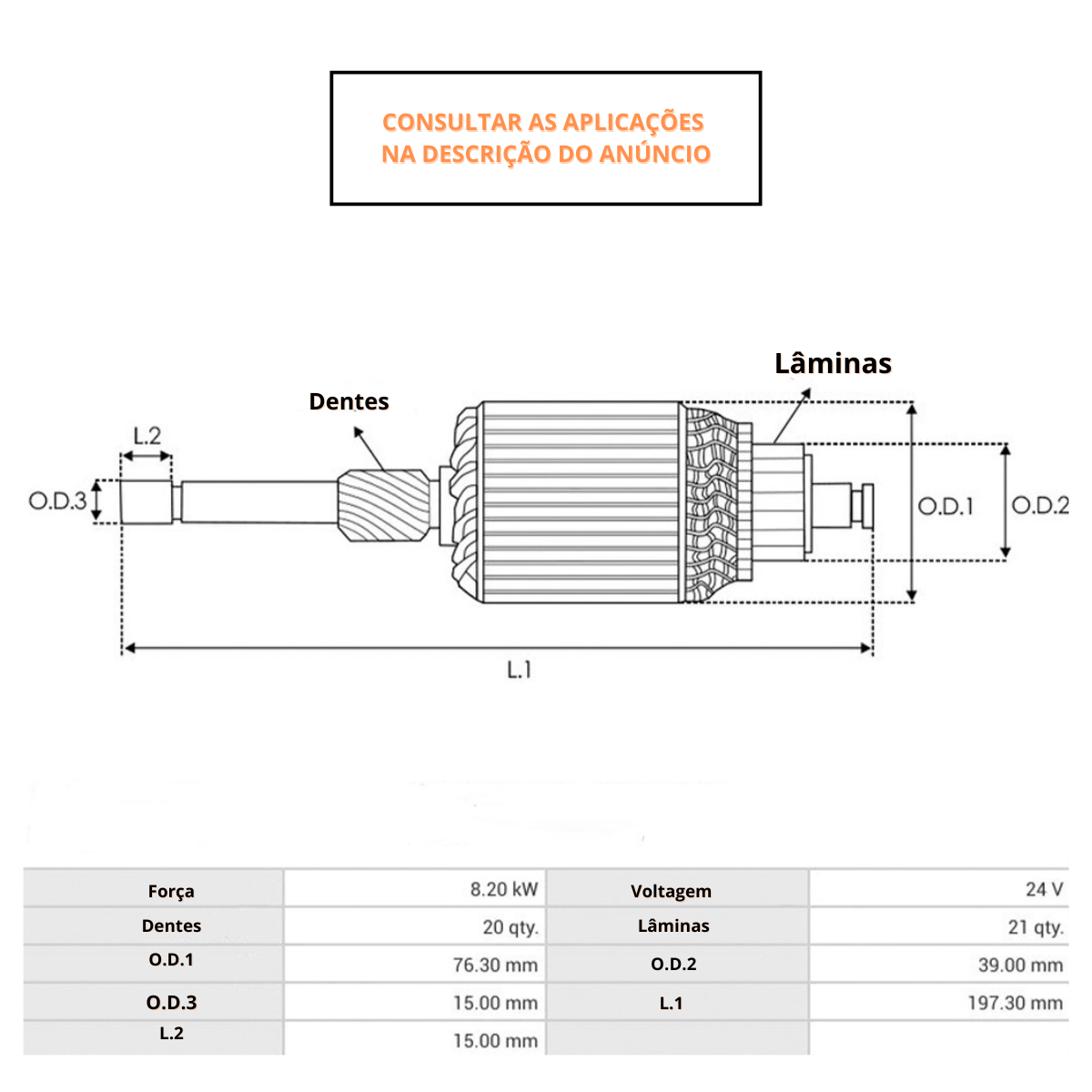 OEM: 10511750 | 20779 | 123021 | 914071 Especificação: Voltagem – 24V | Diâmetro Coletor – 39 mm | Comprimento – 197,00 mm | Diâmetro – 76 mm | Laminas – 21 | Dentes – 20