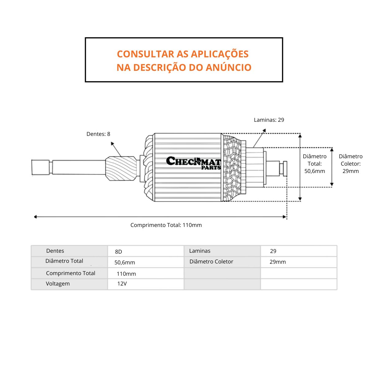 Especificação: Coletor 29 mm | Comp 110 mm | Diametro 50,6 mm | Laminas 29 | Dentes 8 | 12V