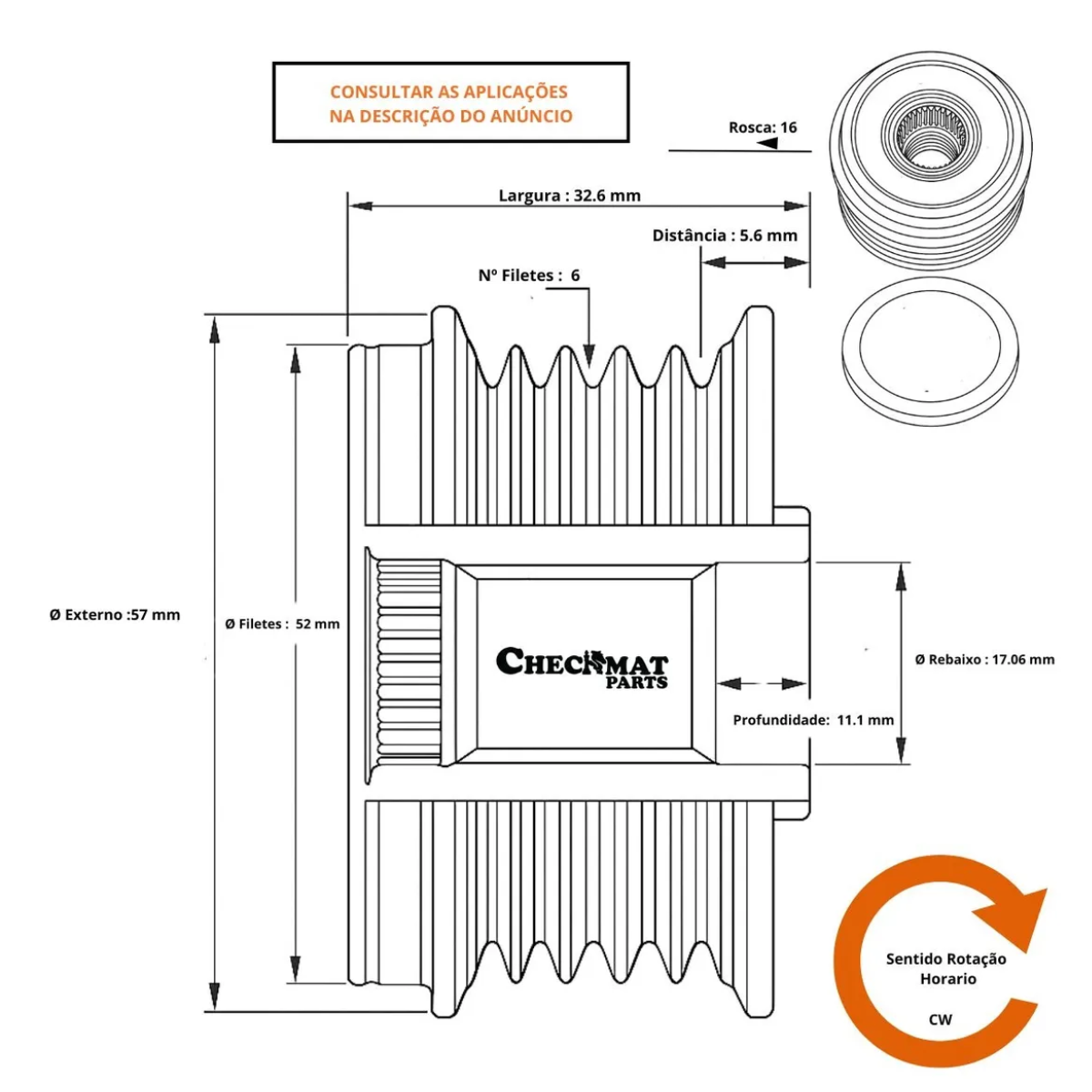 OEM: 04E903201 04E903201A 04E903201E 04E903219B 8V0903119 8V0903119A 04E903219B F000BL9179 F600037 1000358 1000847 920046 535027910 535031510 535036310 04E903201A 04E903201E 04E903219B 8V0903119 8V0903119A 501529 04E903201 04E903201A 04E903201E 04E903219B 8V0903119 8V0903119A; Especificação:   Número de Filetes: R | 6 Diâmetro Filetes: RD | 52 Diâmetro Rebaixo: ID | 17.06 Rosca: S | 16 Largura: W | 32.6 Distância 1º Filete: Z | 5.6 Diâmetro Externo: OD1 | 57 Profundidade do Rebaixo: H | 11.1 Sentido de Rotação: CW | Horário FAMÍLIA: FAM | 500